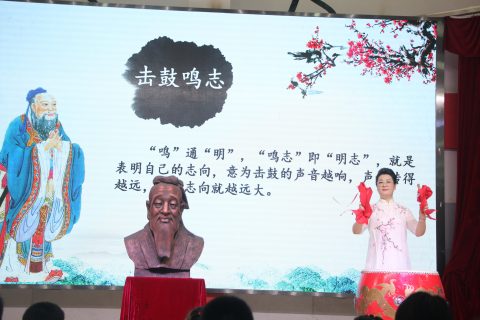 接下来是“击鼓鸣志”,在古代的时候,读书人要到学宫去考取功名,他们进入学宫的时候,往往通过击鼓的方式,表达他们要读书上进和考取功名的愿望,当中的“鸣”通“明”,“鸣志”即“明志”,就是表明自己的志向,意为击鼓得声音越响,声音传得越远,说明志向就越远大,现场由周校长亲自击鼓,鼓声震天,寓意学生从今启蒙,同学们还大声高呼:为天下先,明世间理,努力学习,爱我为明!相信这是每一个为明学子的心声和骄傲!古人云:“人生聪明识字始”,写字识字是学习知识文化的第一步。现场一年级的同学们,在校长及班主任的带领下,手执毛笔,写下了人生第一个“人”字,在此之前,周校长还专门为同学们讲解了什么是“人”,让学生学字先学理。