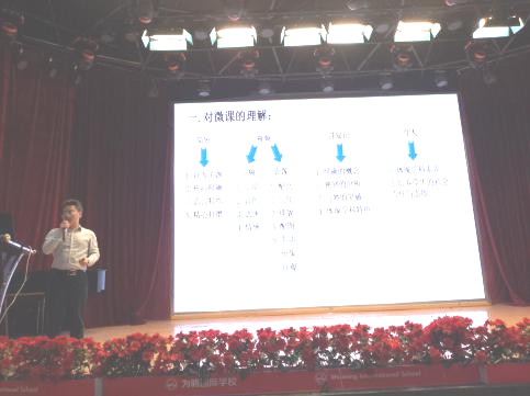 紧接着,教科研徐主任就“课堂与课程”这一主题进行深入、细致的讲解,让老师们明确课程的重要性,区分课程意识和教学意识是不同的。徐主任强调,当今的教育改革重点是课程的改革,老师们要高度关注最新的课程标准,通过2022年的新课标指导教学。作为新时代的教师,要带着强烈的责任感落实教学、特别突出对学生正确价值观的培养,老师的课堂教学要在情境设计和活动设计上下工夫、注意背景资料的收集整理与呈现、发掘主题内容中的学科知识、将具体知识和原理知识相结合、挖掘主题中科学的思想方法、把价值观的教学与科学探究结合起来。课堂教学还要遵循学生的认知规律:由易到难——由浅入深——循序渐进、由简单到复杂——从现象到本质——由典型到一般、由宏观到微观——由感性到理性、由已知到未知——温故知新,设计的知识内容要符合学生的认知水平:图像——动作——符号(语言、文字)。新时代的课堂,需要教师的管理方式和思维观念转变,所以,抓课堂应是学校和教师的主责主业。教师对课堂的设计要有人性、有温度、有故事、有美感,经过从“遭受、忍受”到“感受和享受”课堂境界的转变才是作为教师最大的成就,而微课的制作也应该遵循以上的原则。