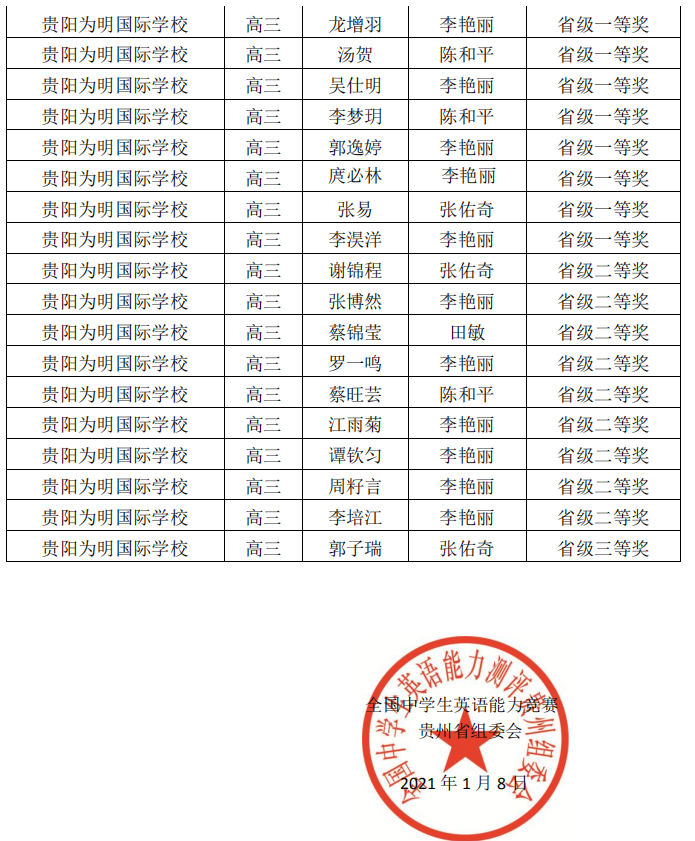 百花齐争艳,桃李尽芬芳。此次获奖是对贵阳为明国际学校高中部学生英语水平的肯定和激励,更是对我校英语教师团队的赞许。正是因为英语组的老师们在英语教研组长李梅老师的组织和引领下,研究新课程标准,为适应新高考积极进行各种教学探索,开展原著阅读,以提高学生们的英语学科核心素养。在此过程中,孩子们英语水平迅速成长,学习热情日渐高涨,才使得整体成绩有了明显提升。