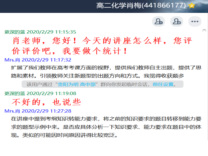 这次培训虽然是网络形式,但是老师们都觉得“实操性”很强,为指导我校高三二三轮备考指明方向,同时即将进入高三的老师也受益匪浅,为以后的教学指明方向,高二级部化学备课组长肖梅老师还融入了自己的思考,改进自己的教学,虽然短短的几句话,也体现的这位年轻的备课组长的专业水平!