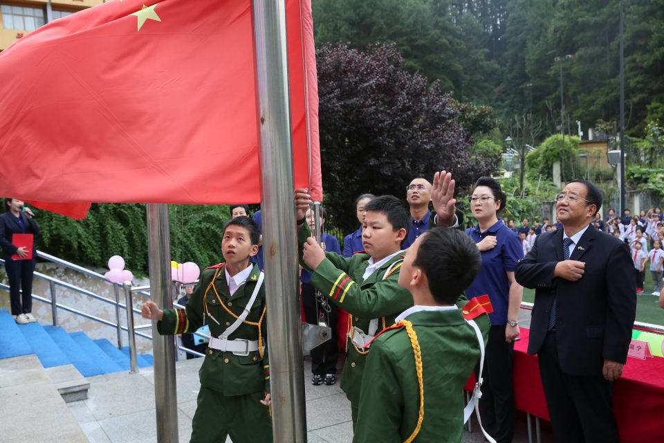 开学典礼第一项为举行庄严的升旗仪式,全场少先队员行少先队礼,奏唱国歌,五星红旗在催人奋进的旋律中冉冉升起。