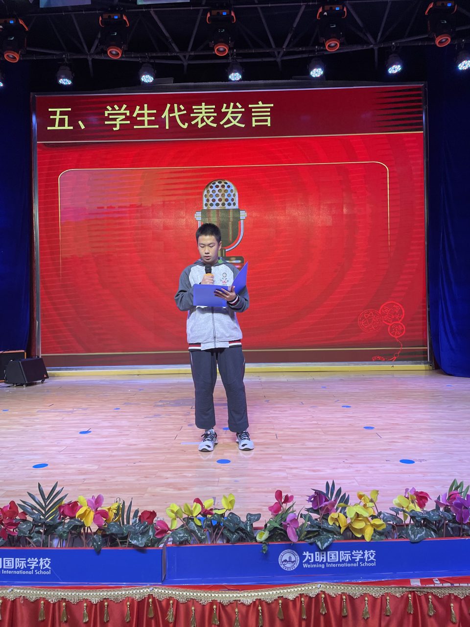 来自高一三班的明朗同学作为学生代表发言。他表示虽然刚刚加入我们为明大家庭不久,他感受到了为明大家庭的爱。发言中提到“为明老师们的负责”以及“为明学习氛围的营造良好”。呼吁同学们珍惜现在的学习环境和氛围,努力学习。